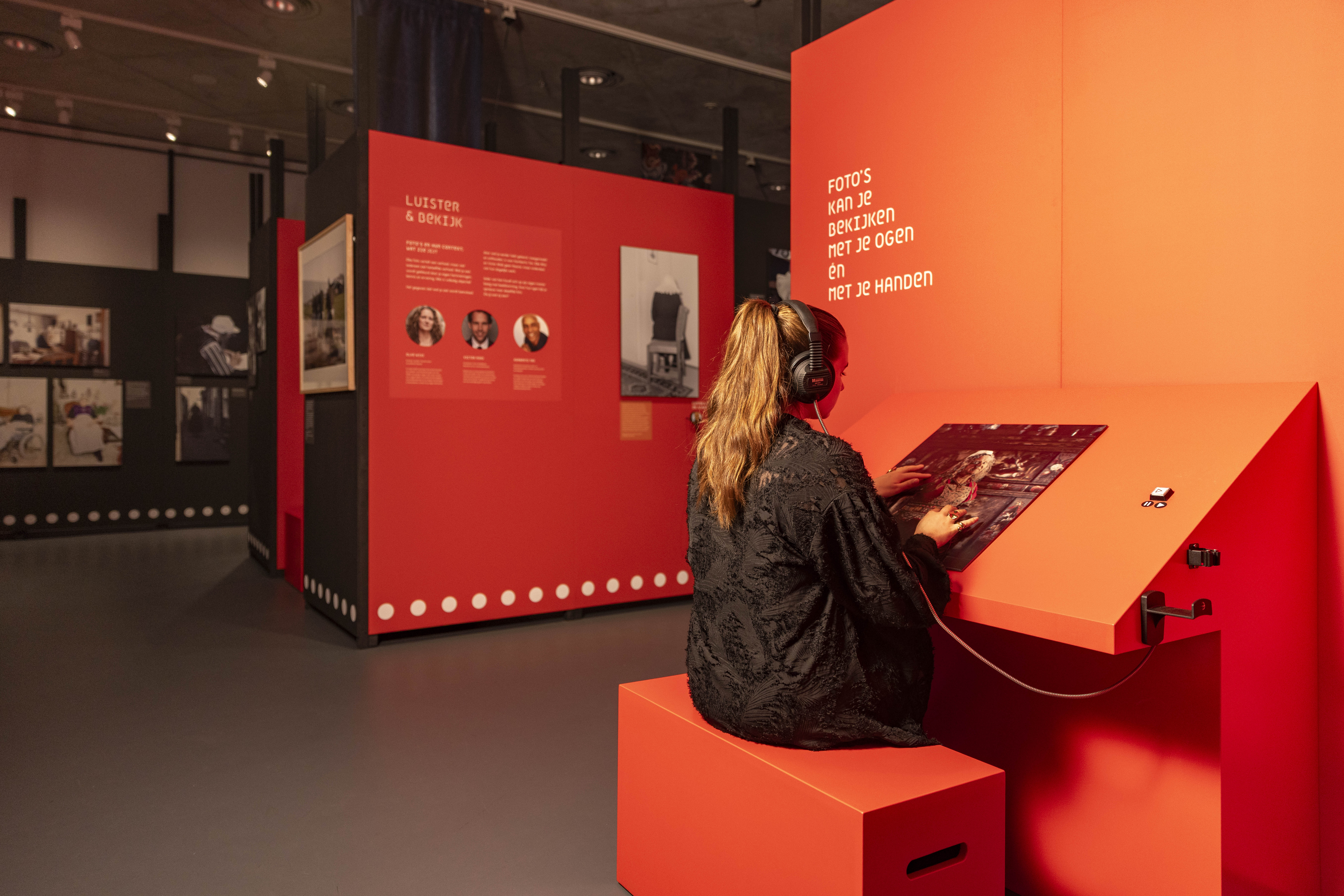 Bezoeker die reliëffoto van Jimmy Nelson voelt en luistert naar audio